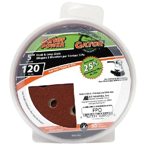 Enjoy smooth and clean finishes with a Gator sanding disk. This disk has a fine sanding calibre and comes in packs of 50. The 5 in sanding disk helps clean up wood and other surfaces. The aluminium oxide feature enhances longevity. The hook and loop sanding disk comes with a hardened attaching system for easier attachment and removal.