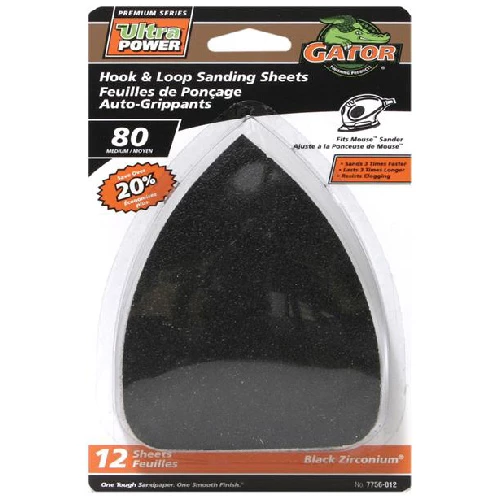 Use this Gator Mouse sandpaper to smoothen various surfaces. It has an 80 grit surface which is ideal for various surfaces. This zirconium oxide sandpaper has a hook and loop for quick changeovers. A pack of these black 3 3/4 in W x 5 1/4 in L coarse grit sandpapers contains 12 sheets.