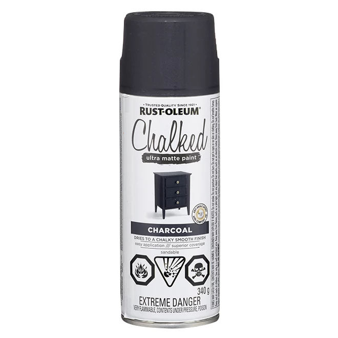 This chalked ultra matte paint from Rust-Oleum® provides one coat coverage on most surfaces with little or no prep or priming. It dries to a chalky, smooth finish and can be painted, sanded or aged giving any project a one-of-a-kind look. The aerosol can is convenient to use and makes application easy. You can use it on wood, metal, ceramic, glass, canvas and more. For indoor use only. Use chalked protective topcoat for added protection. Charcoal colour.