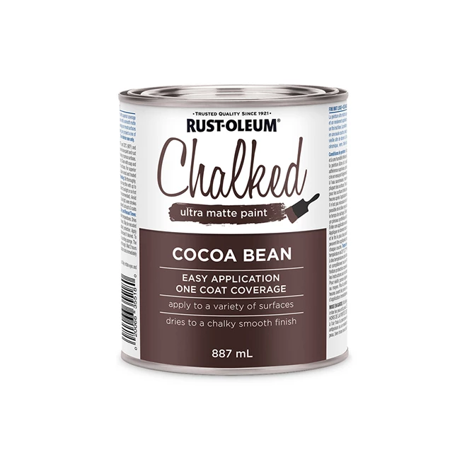 With Rust-Oleum(R) chalked paint, you can give an aged look to wood furniture and even create a distressed look using two different colours. Chalked paint creates a smooth, ultra matte finish in a couple of coats. A gorgeous velvety, chalky finish can be created using a synthetic brush and lightly feathering the paint as it is applied. Finish your project with a Rust-Oleum(R) chalked protective topcoat. Rejuvenate furniture and even paint your kitchen cabinets for a whole new look. Cocoa Bean colour. 887 ml