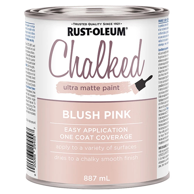 Rust-Oleum(R) Chalked Ultra Matte Paint creates an ultra-matte finish with superior adhesion and coverage. It rejuvenates furniture and home décor with timeless elegance. It can be painted or distressed, giving any project a one of a kind look with a vintage feel. Easy application, one coat coverage. Applies to a variety of surfaces. Dries to a velvety smooth finish. Indoor use only. Blush Pink. Container size: 887 ml.