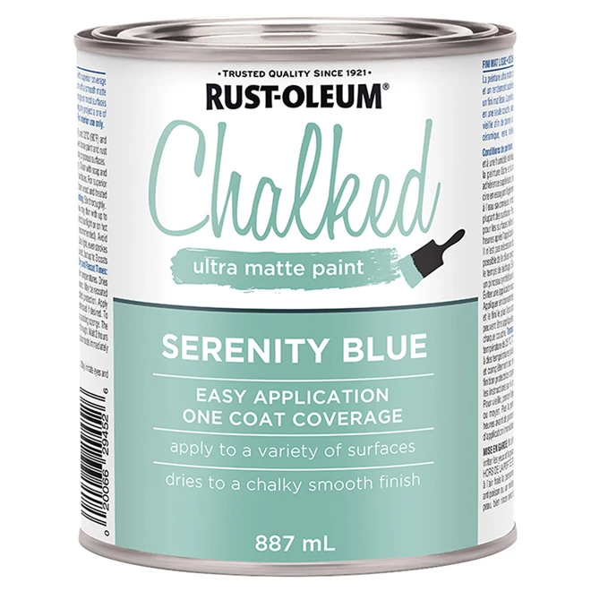 Rust-Oleum(R) Chalked Ultra Matte Paint creates an ultra-matte finish with superior adhesion and coverage. It rejuvenates furniture and home décor with timeless elegance. It can be painted or distressed, giving any project a one-of-a-kind look with a vintage feel. Easy application, one-coat coverage. Applies to a variety of surfaces. Dries to a velvety smooth finish. Indoor use only. Serenity Blue.