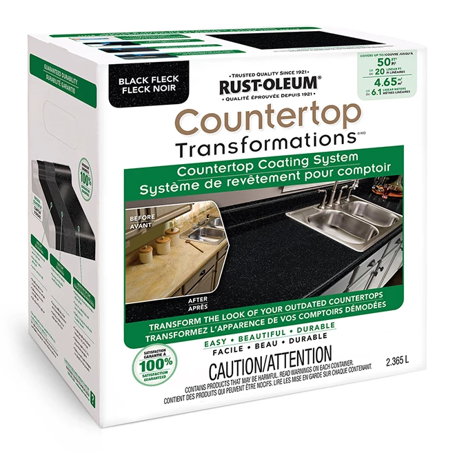 The Rust-Oleum(R) Countertop Transformations system allows you to update the look of your kitchen counters, bathroom surfaces, bars and tabletops. The treated glossy surface is resistant to fading, mildew and stains. The countertop coating is easy to use and adheres with a single-coat application. The low-odour and low VOC product cleans up easily with soap and water. Your new countertop is washable and scrubbable and it will not dull over time.