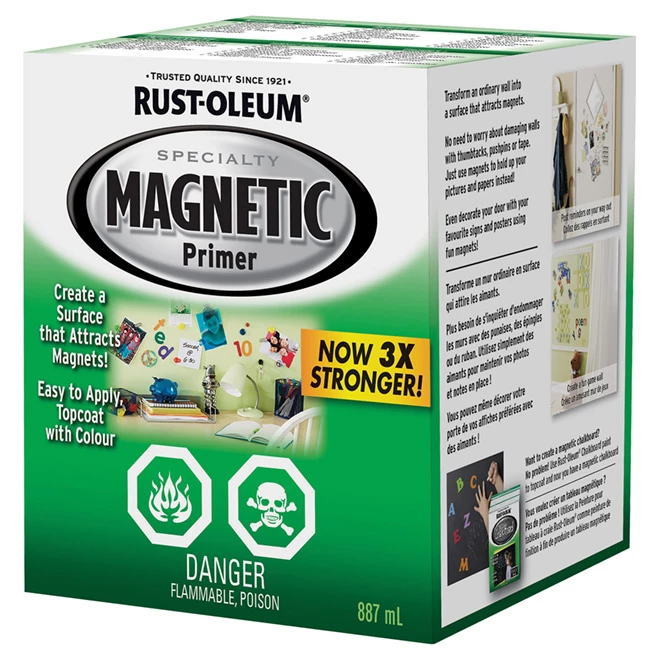 Create a surface that attracts magnets with this Rust-Oleum specialty magnetic primer. Alkyd base. Easy to apply. Now 3X stronger. Can be top-coated with any colour, or with Rust-Oleum Chalk Board paint to create a magnetic chalkboard. Colour: light grey. 887 ml format.